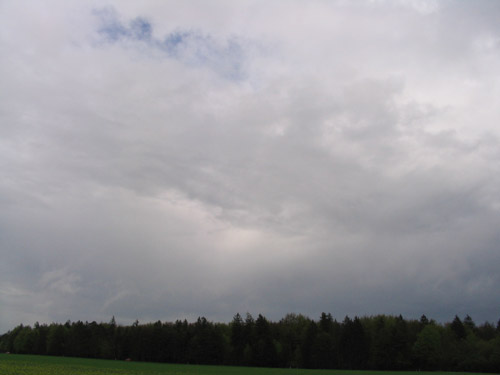 Auf dem Weg weiter nach Süden hatte sich das Gewitter abgeschwächt, ich konnte keine weiteren Blitzentladungen mehr beobachten. Von Norden wurde nun der blaue Himmel zwischen Wolkenlücken sichtbar, siehe das erste Foto. In Richtung Süden konnte ich aus den Wäldern hochsteigende Nebelfetzen beobachten. Es hatte nach dem Gewitter nur wenig abgekühlt, und hier an meinem Standort kam nun wieder die Sonne heraus. Es wurde gleich wieder drückend und es bildeten sich in nördlicher Richtung rasch niedrige Quellwolken. Ich bin dann wieder nach München zurückgefahren. Kaum war ich wieder zu Hause, zog die nächste dunkle Wolkenfront heran mit Windböen und Starkregen, siehe die beiden Fotos unten. Die zweite Front brachte besonders dem Münchner Südosten ein weiteres Gewitter, und danach ist die Temperatur merklich gefallen.