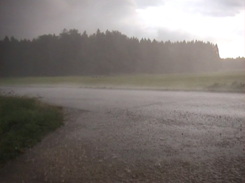 Zu Beginn fielen 2 cm große Hagelkörner herab, welche relativ laut auf das Blech meines Fahrzeugs knallten, siehe das erste Foto. Der Hagelschauer mit den größeren Körnern dauerte aber nur für kurze Zeit, dann ging es mit kleinerem Hagel bis 1 cm, Platzregen und Sturmböen weiter. Der Regen- und Hagelsturm fegte über ein Maisfeld an meinem Standort hinweg. Danach flaute der starke Wind deutlich ab, es gab aber noch für mindestens 20 Minuten dichten und anhaltenden Starkregen, siehe das Foto unten. Bedingt durch den Starkniederschlag standen in der Gegend die Strassen im Wasser.