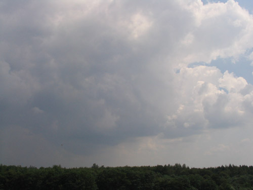 Diese Bilder habe ich ab 12:30 Uhr in der Nähe von Schäftlarn im Münchner Süden aufgenommen. Hier bildete sich von Norden her sehr schnell eine Gewitterzelle. In Richtung Isartal wurde es rasch dunkler, um 13:30 Uhr konnte ich beginnenden Niederschlag erkennen, und kurz darauf gab es eine Blitzentladung mit dumpfem Donnergrollen. Das Gewitter schwächte sich aber sehr schnell wieder ab, es gab keine weiteren Blitzentladungen mehr, und bei Schäftlarn regnete es keinen Tropfen. Ich habe von dem dumpfen Donnergrollen auch einen Videofilm eingestellt, zu finden im Videoarchiv. Weiter in Richtung München-Grünwald hatte es auch nur mäßig geregnet. Nach dem kurzen Gewitter gab es hier bei schwülwarmer Temperatur weitere hochwachsende Haufenwolken, siehe das Foto unten, aber kein Gewitter mehr.