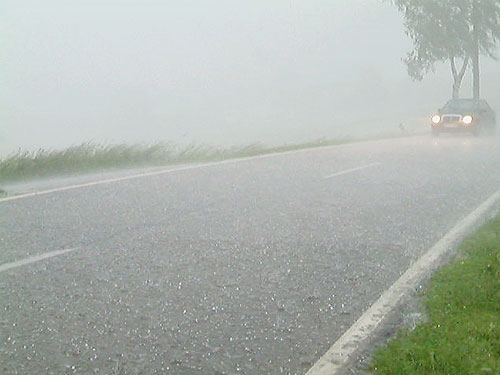 Zuerst gab es stärkeren Regen mit einzelnen Hagelkörnern vermischt, siehe das erste Foto. Dann kam der Hagelfallstreifen näher, und es begann hier heftig zu hageln. Es gab zu Beginn des Hagelschauers auch Sturmböen, die mein Auto heftig schüttelten, und die Hagelkörner knallten sehr laut an die Fahrerseite meines Autos. Der Hagelschauer war zu Beginn kleinkörnig, wuchs aber dann an und manche Hagelkörner erreichten hier einen Durchmesser von ca. 2,5 cm. Ich habe von dem sehr dichten Hagelniederschlag auch einen Videofilm eingestellt, zu finden im Videoarchiv. Der Hagelniederschlag trommelte bestimmt 10 Minuten lang auf die Gegend und mein Auto ein, dann hörte es fast schlagartig auf zu hageln, und es regnete leicht weiter. Es gab dann noch einige nahe Blitzentladungen, die aber alle in den Wolken entluden. Es bildete sich hier rasch ein dichter Bodennebel, der von dem frischen Wind verweht wurde, siehe das Foto unten.
