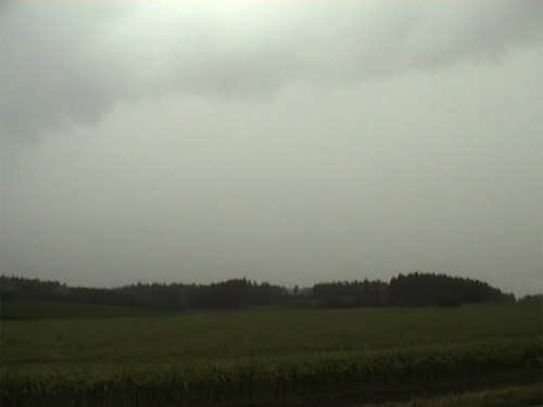 Etwa 30 Minuten nach Beginn des Unwetters lockerte die Wolkendecke von Nordwesten wieder auf. In Richtung Südosten blitzte und donnerte es aber immer noch ziemlich oft. Hier in der Gegend standen die Felder im Wasser, und viele Straßen waren überflutet. Ich konnte auch immer wieder vom Sturm abgerissene Äste und Zweige entdecken, die am Straßenrand lagen. Ich bin dann wieder nach München zurückgefahren. Hier regnete und gewitterte es bei meiner Ankunft immer noch, siehe das Foto unten. Es ist hier nach dem Gewitter richtig kalt geworden, und es regnete den Nachmittag über leicht weiter.