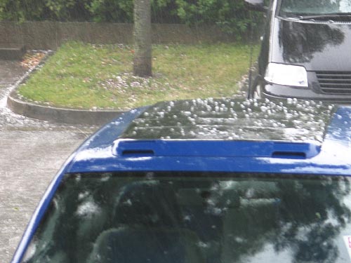 Heute gab es bereits am Morgen in München zwei Gewitter mit mehreren Blitzentladungen und starken Regen. Danach regnete es am Vormittag bei feuchtwarmer Temperatur zeitweise schauerartig verstärkt, bevor ab Mittag die Sonne zum Vorschein kam. Es heizte auf drückende 24 Grad Celsius auf, und es bildete sich ab ca. 13:00 Uhr westlich von München rasch eine Gewitterfront. Diese Gewitterfront kam unter Verstärkung relativ schnell von West nach Ost voran, und erreichte das westliche Stadtgebiet um ca. 14:30 Uhr. Bei diesem Gewitter gab es besonders im nordwestlichen und nördlichen Stadtgebiet bis zu 2 cm großen Hagel sowie schwere Sturmböen. Die folgenden Bilder von dem heftigen Hagelgewitter wurden mir freundlicherweise von Kai Schmerer aus dem Münchner Norden, in der Nähe vom Olympiastadion, zur Verfügung gestellt.