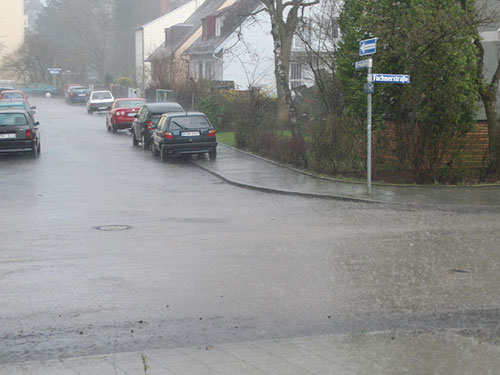 Gleich darauf gab es einen kräftigen Platzregen mit dicken Tropfen. Dazu gab es stürmische Böen aus nordwestlicher Richtung, welche den Regen über die Straßen peitschten. Der von den stürmischen Böen begleitete Starkniederschlag dauerte ca. 5 Minuten lang an, dann regnete es noch leicht mehrere Minuten lang weiter bei rasch abflauendem Wind. Bedingt durch den starken Regen stand hier das Wasser auf der Straße.