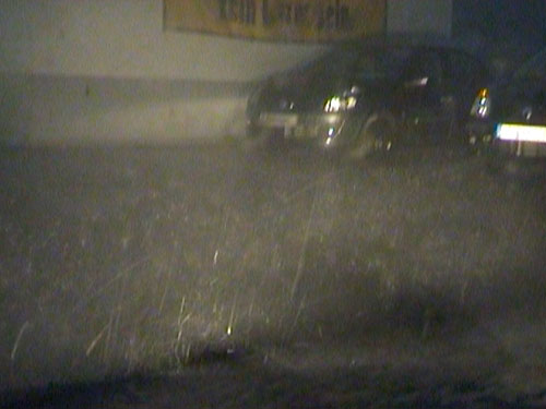 Gleich darauf mischte sich immer mehr Hagel zwischen den Starkregen. Kurzzeitig hagelte es nur noch, und die Hagelkörner erreichten an meinem Standort einen Durchmesser von bis zu 2,5 cm. Es hagelte ca. 3 Minuten lang kräftig, dann ging es noch mit einem 5 Minuten andauernden Wolkenbruch weiter, siehe das Foto unten. Während dieser Zeit gab es auch immer wieder Blitzentladungen in den Wolken zu beobachten. Ich habe von dem Hagelschauer auch einen Videofilm eingestellt, zu finden im Videoarchiv.