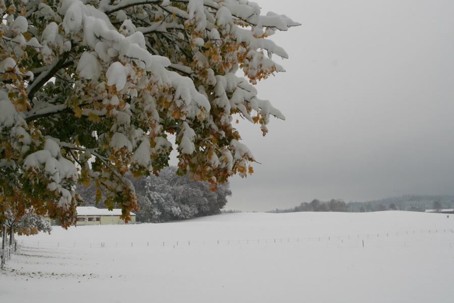 Zwischen dem Abend vom 27.10.2012 bis zum Vormittag des 28.10.2012 hat es im südlichen Oberbayern anhaltenden Schneefall bei leichtem Frost gegeben. In den südlichen Bereichen des Stadtgebiets München gab es 12 cm Neuschnee. Weiter südlich, oberhalb von 600m bis 700m gab es 15 cm und mehr Neuschnee. Im südlichen Alpenvorland auf 800m bis zum Alpenrand gab es 20 bis 25 cm Neuschnee, in guten Staulagen noch mehr. Es gab viele abgebrochene Äste und umgefallene Bäume durch den schweren Schnee auf den noch belaubten Bäumen. Der Zugverkehr zwischen dem Alpenrand und München war zeitweise wegen umgefallenen Bäumen eingeschränkt oder unterbrochen. Zum Vergrößern der Bilder einfach auf die Bildvorschau klicken.Wetterbilder