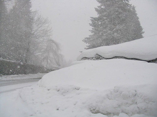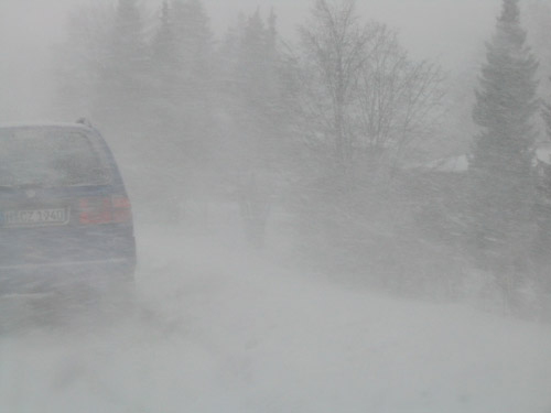Nach einer kurzen Wetterberuhigung gab es am 12. März 2005 einen erneuten Wintereinbruch. Es gab am Nachmittag einen dichten Schneesturm, welcher von Nordwesten über Bayern hinwegfegte. Die folgenden Bilder sind ab 16:00 Uhr im südlichen Münchner Landkreis entstanden. Hier konnte ich zuerst eine deutlich ausgeprägte Böenfront und dann den dichten Schneesturm beobachten. Die Sichtweite ging zeitweise unter 50 Meter zurück, dazu gab es starke Schneeverwehungen und erhebliche Verkehrsbehinderungen. Ich habe von dem Schneesturm auch einen Videofilm eingestellt, zu finden im Videoarchiv. Auch in München-Stadt hatte der Schneesturm für glatte Straßen gesorgt, siehe die beiden Fotos unten.